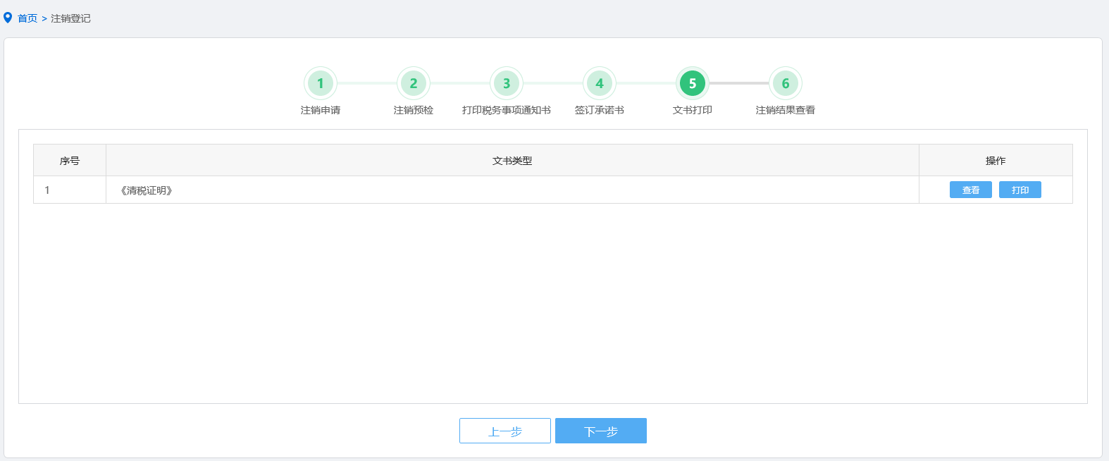 “一照一码”户可打印《清税证明》;非“一照一码”户打印《税务事项通知书》(注销税务登记通知)。