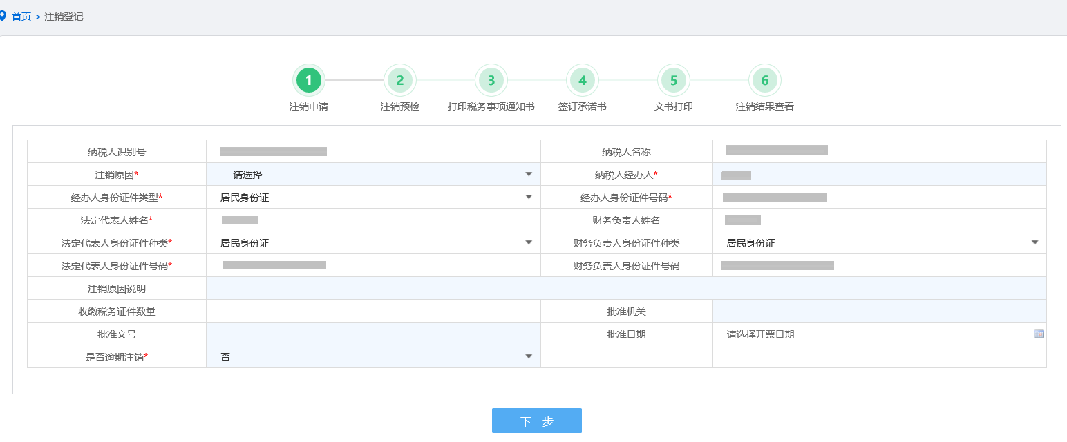(2)纳税人根据实际情况选择注销原因及相关信息后点击“下一步”。