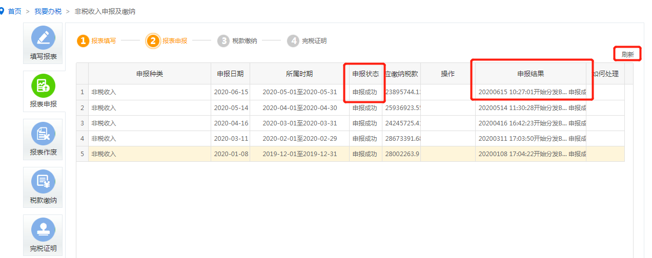 申报后可点击“刷新”按钮查看申报状态及申报结果。