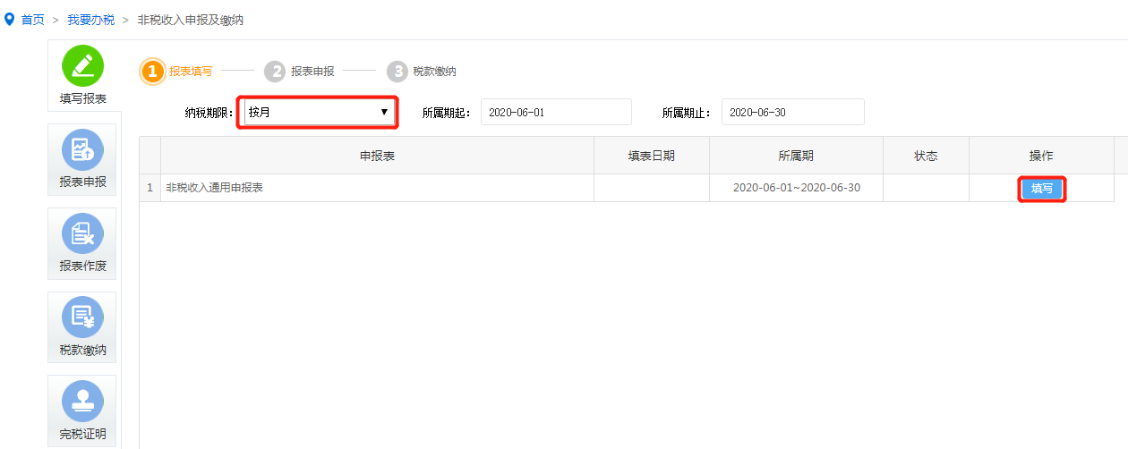 选择纳税期限按次、按月或按季等申报,点击“填写”按钮;