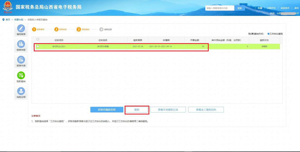 缴款方式支持三方协议缴款,若申报后有应征税款的,在点击“获取缴款信息”可带出相应税款。点击“缴款”可完成税款缴纳。