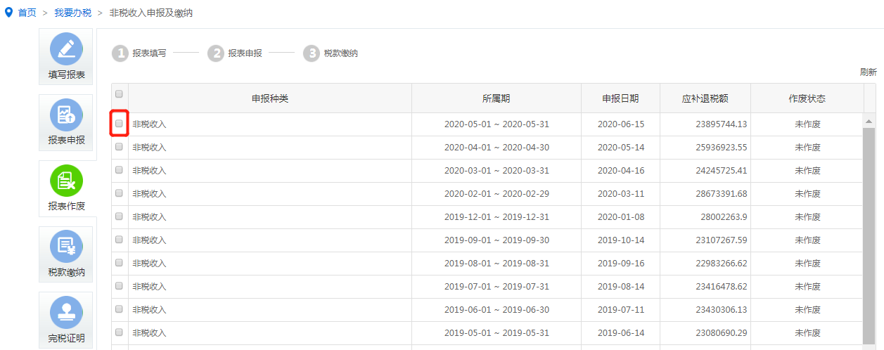 申报表申报完成后,可在报表作废列表中选择要作废的申报表点击“作废申报”按钮作废申报表。