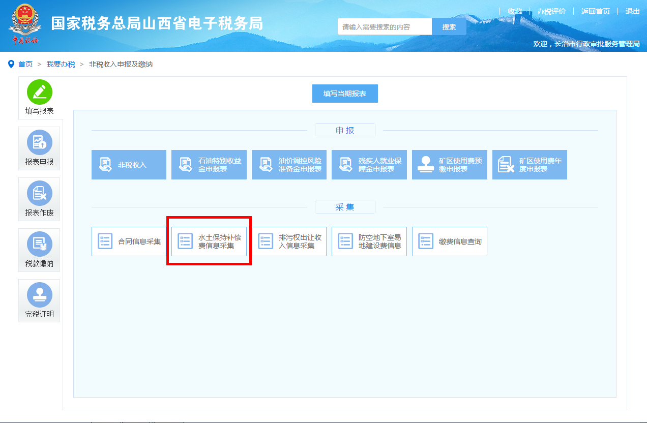 纳税人进入后选择填写报表区域点击【水土保持补偿费信息采集】按钮进行信息采集。