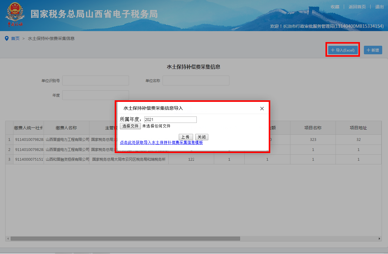 2、导入(Excel):点击右上角【导入(Excel)】可进行水土保持补偿费采集信息文件导入、模板下载