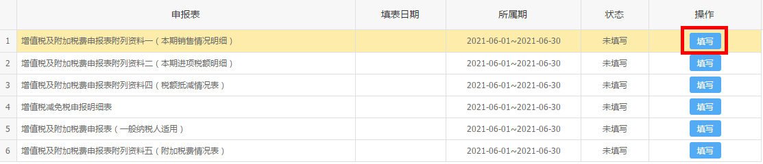 3.纳税人选择该申报表对应的申报表菜单后,即可看到申报表填写列表页面。