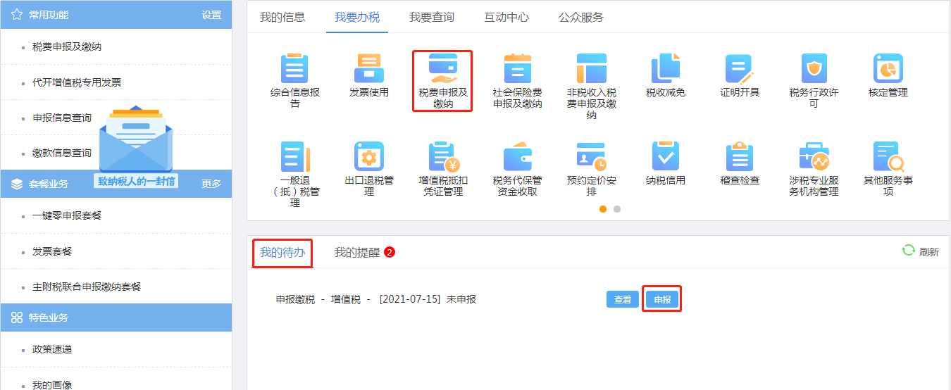 1.在首页屏幕下方查看“我的待办”,电子税务局会提示您当前未申报的税种及申报截止日期。点击待办区的“申报”按钮或“税费申报及缴纳”模块办理申报缴税业务。