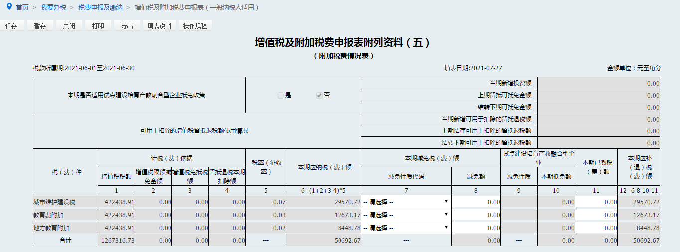 《增值税及附加税费申报表附列资料(五)(附加税费情况表)》该表数据已根据主附表关系自动生成。核实报表无误后,点击左上方的“保存”按钮。