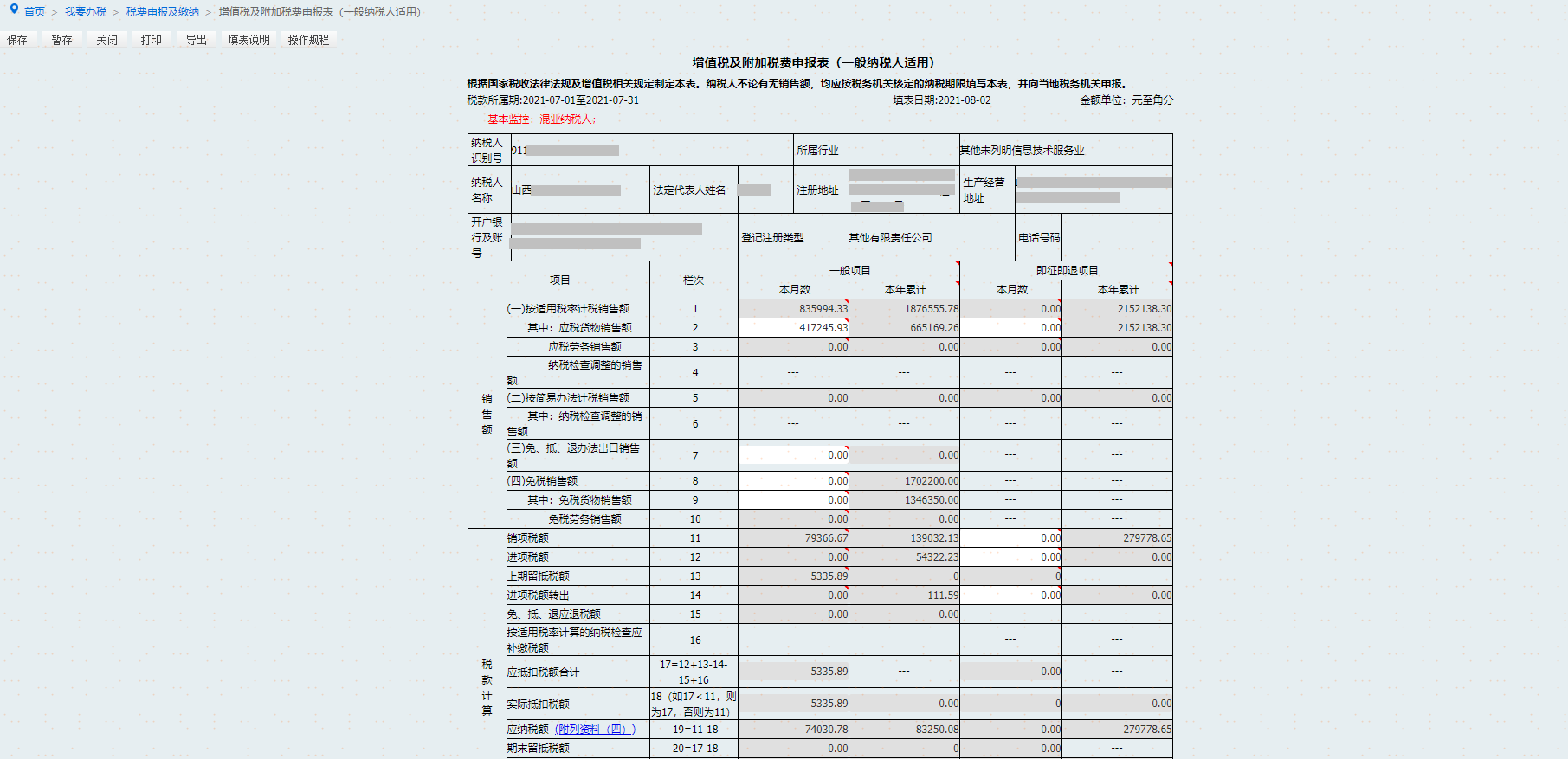 4.点击申报表对应的“填写”按钮进入该报表。核实《增值税及附加税(费)申报(一般纳税人适用)》无误后,点击左上方的“保存”按钮。