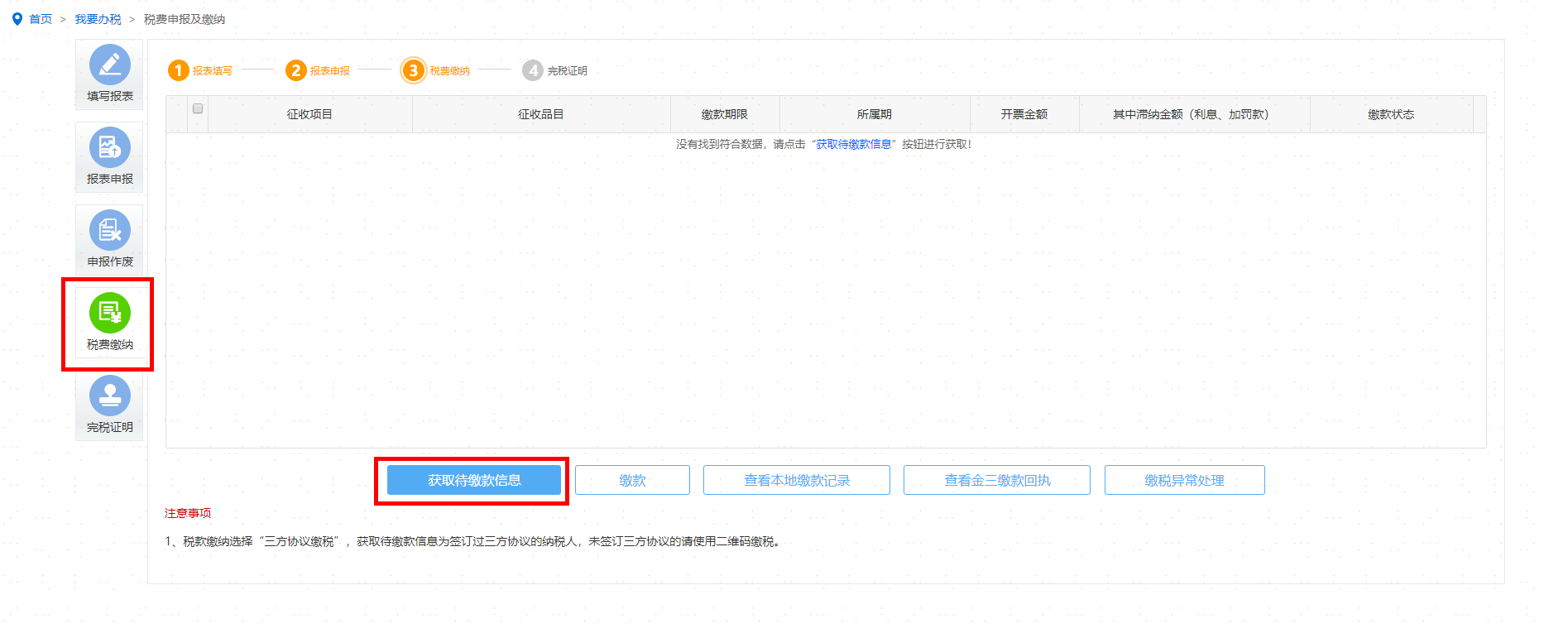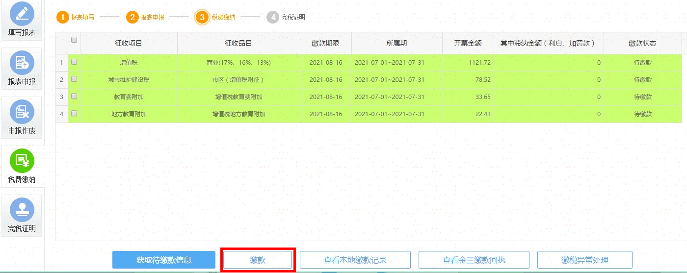 1.对于产生应纳税额的,点击左侧的“税费缴纳”按钮进行缴款。