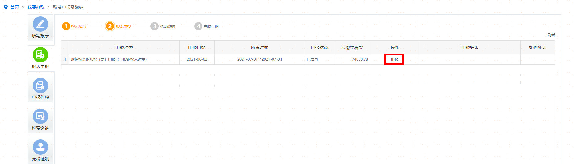 纳税人填写并保存报表后,系统会显示出已填写完成,但尚未申报的报表,点击“申报”按钮。