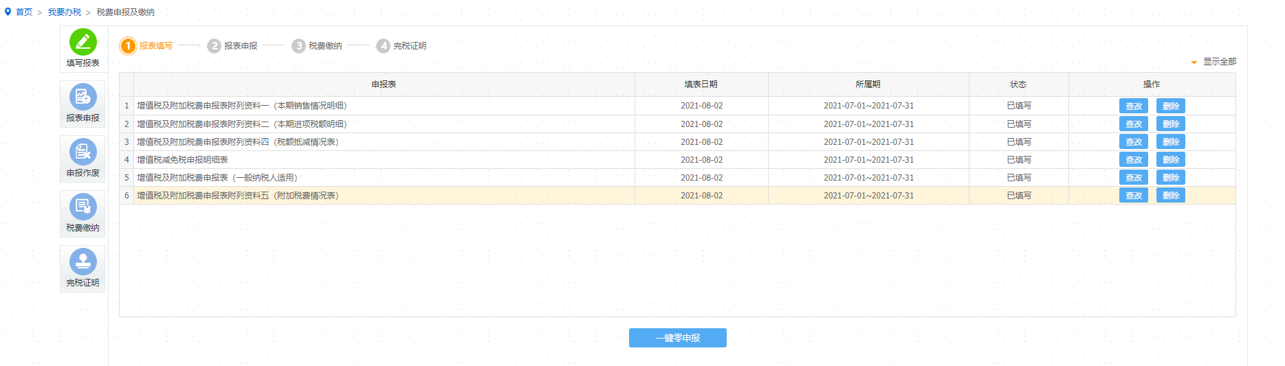 8.依次将推送的申报表填写完成并保存后,申报表后面对应功能发生调整,出现“查改”和“删除”按钮,点击“查改”按钮可对相应的申报表进行修改,点击“删除”按钮可将对应的报表删除后重新填写。