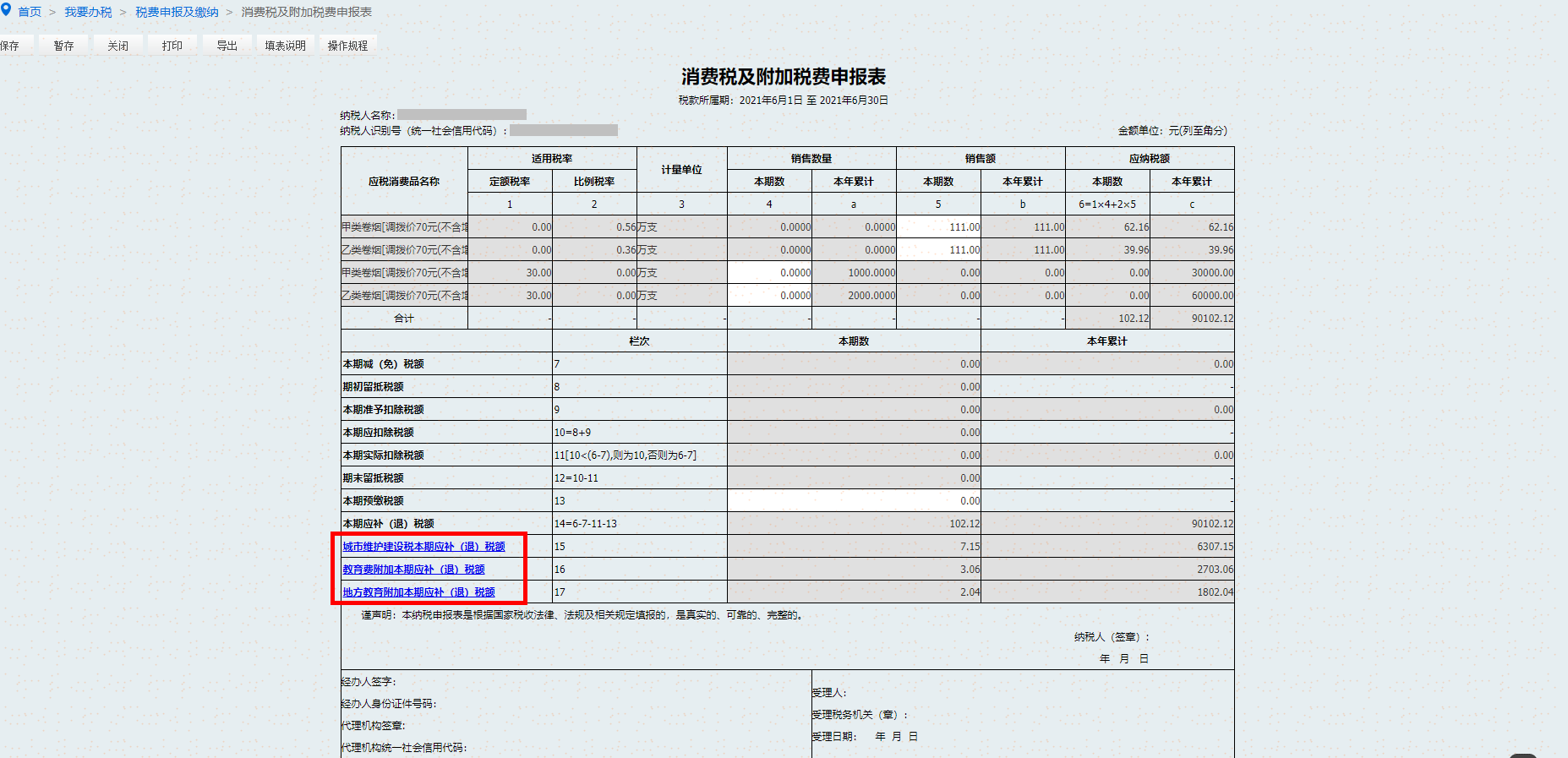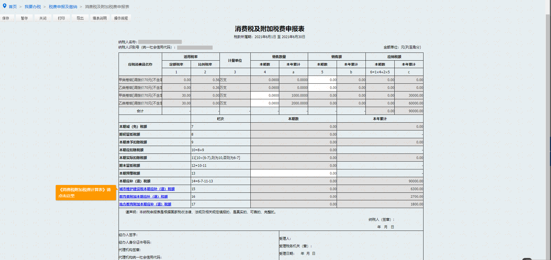 纳税人通过《消费税及附加税费申报表》点击15.16.17行链接至申报附加税费信息。