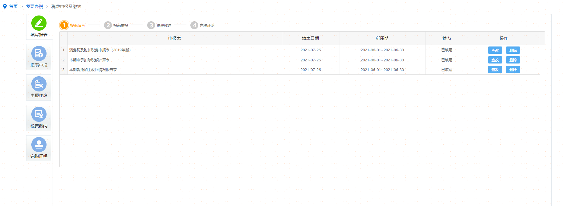 依次将推送的申报表填写完成并保存后,申报表后面对应功能发生调整,出现“查改”和“删除”按钮,点击“查改”按钮可对相应的申报表进行修改,点击“删除”按钮可将对应的报表删除后重新填写。