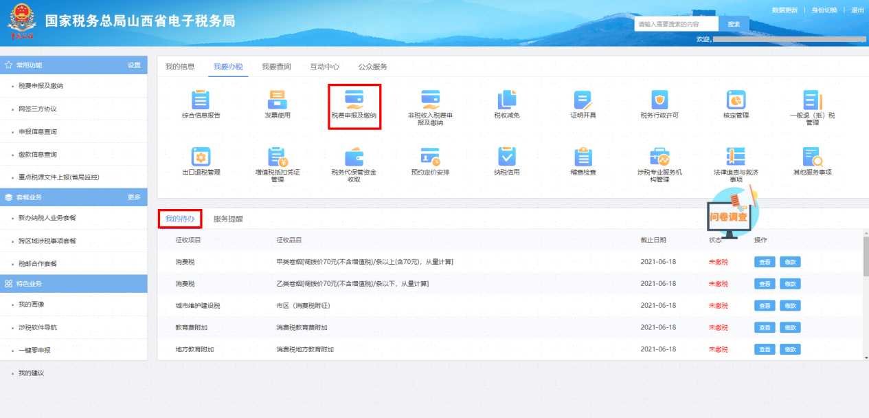 1.在首页屏幕下方查看“我的待办”,电子税务局会提示您当前未申报的税种及申报截止日期。点击待办区的“申报”按钮或“税费申报及缴纳”模块办理申报缴税业务。