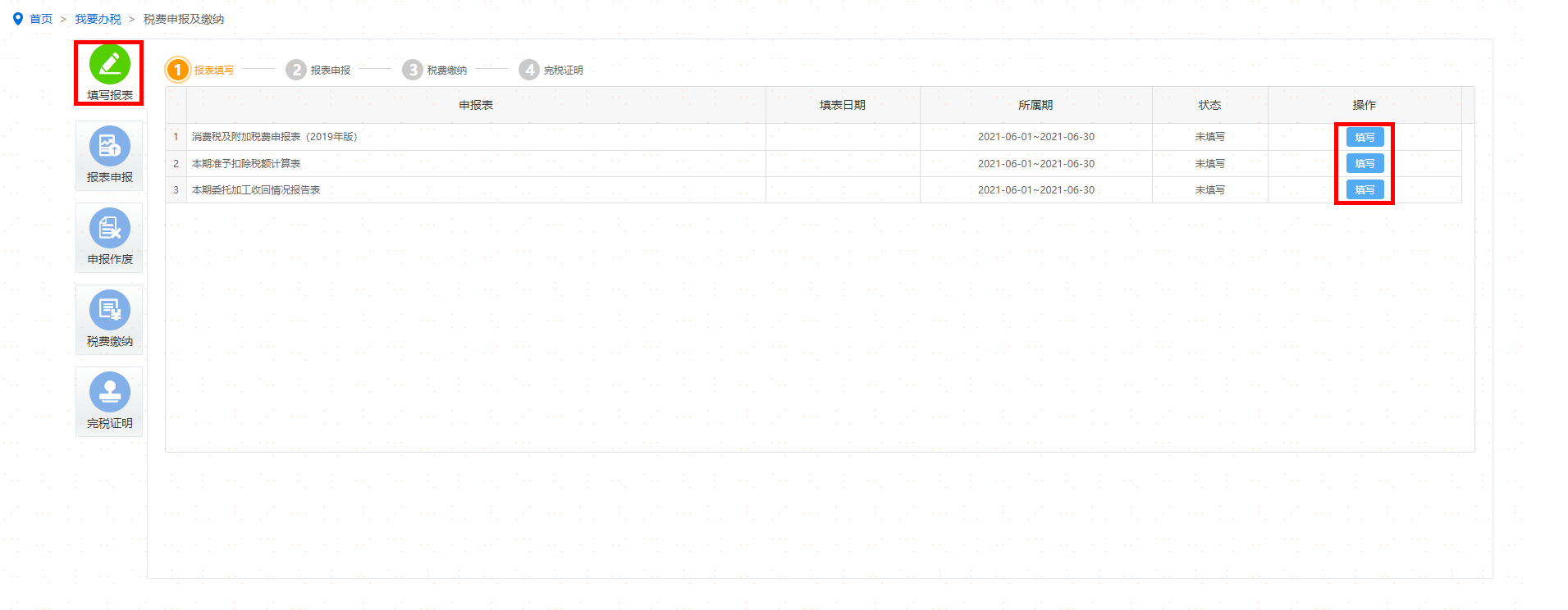 3.纳税人选择该申报表对应的申报表菜单后,即可看到申报表填写列表页面。