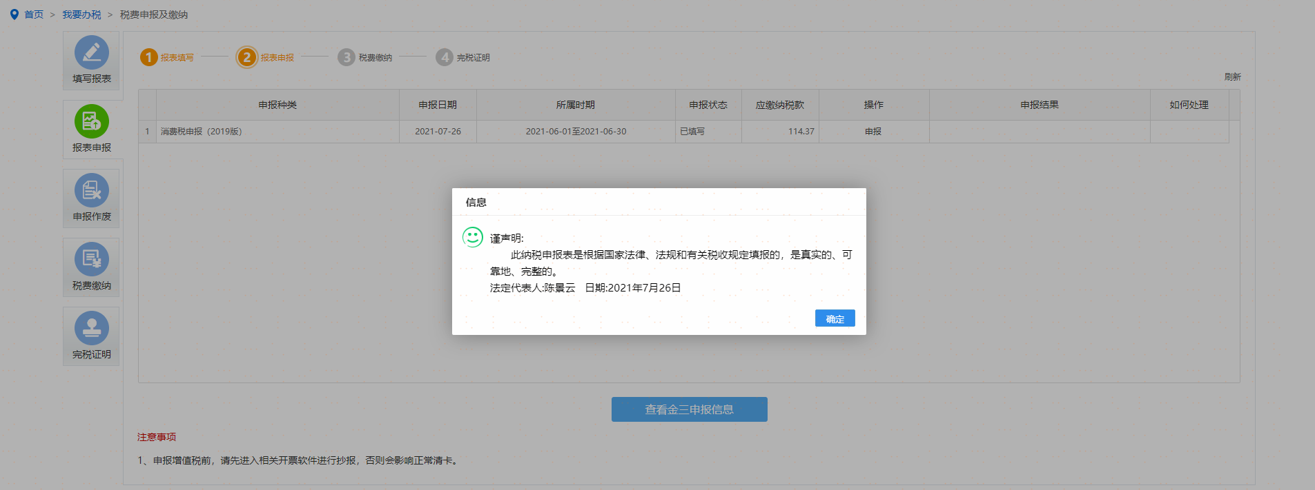 信息核实无误后,点击申报表对应的“申报”按钮,自动弹出声明提示,点击确认按钮后完成申报表提交,如图