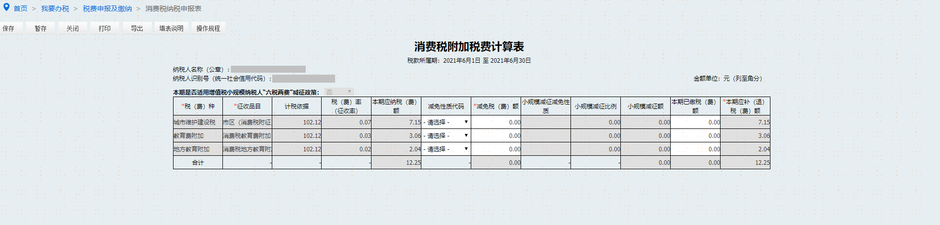 4.报表中白色底纹项目需据实填写,灰色底纹的单元格为自动计算或自动带出结果且不可修改,“—”符号代表不可填写项目。点击申报表对应的“填写”按钮进入该报表。核实《消费税及附加税费申报表》无误后,点击左上方的“保存”按钮。