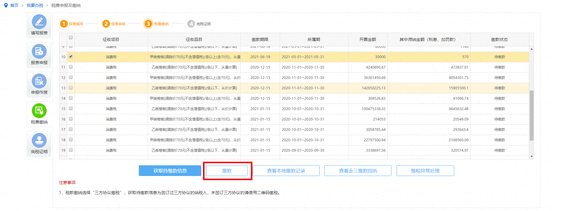 1.对于产生应纳税额的,点击左侧的“税费缴纳”按钮进行缴款。