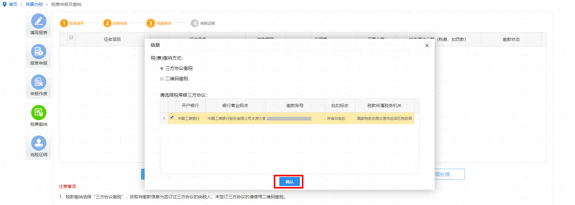 2.缴款方式可选择三方协议缴税或二维码缴税。