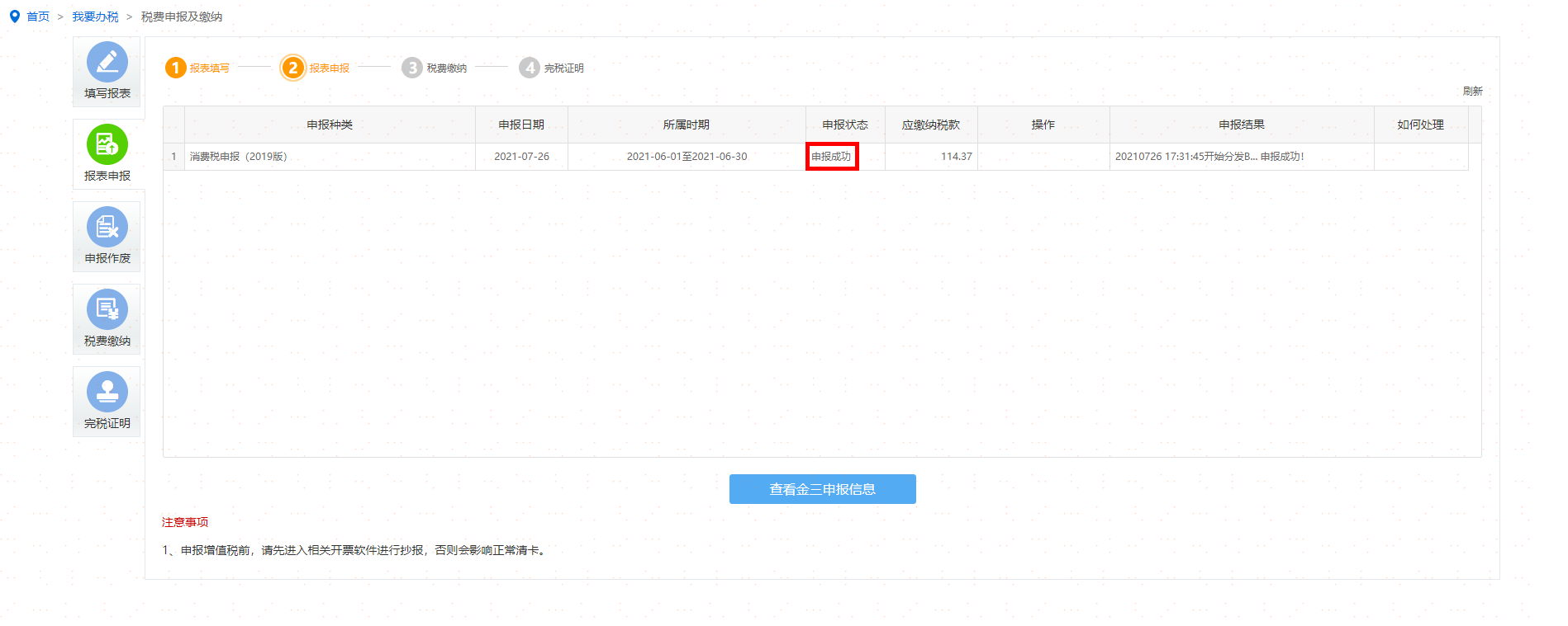 点击“刷新”按钮,当“申报状态”显示为“申报成功”,则表明您填写的申报表已传入税务局核心征管系统。完成了本期消费税申报。