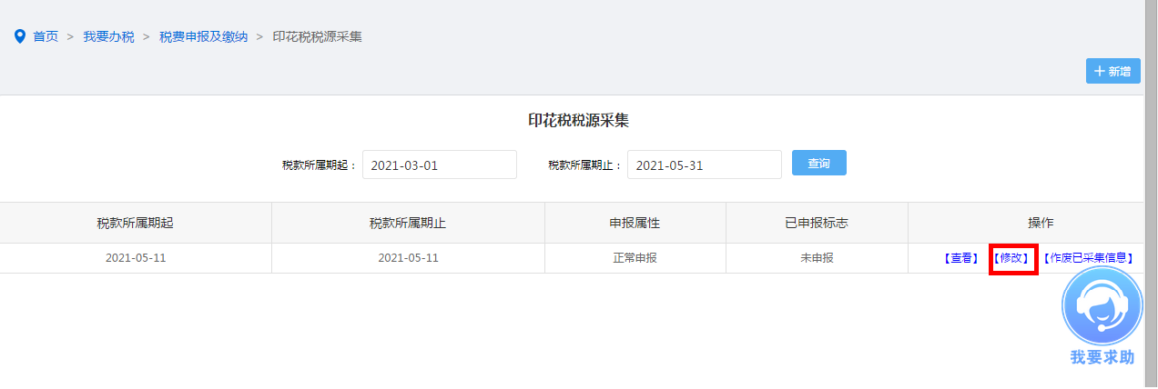如您已进行印花税税源信息采集,需对已经采集的税源信息进行修改,可通过税款所属期筛选后点击修改按钮进入修改,修改完成后点击保存按钮完成更正。