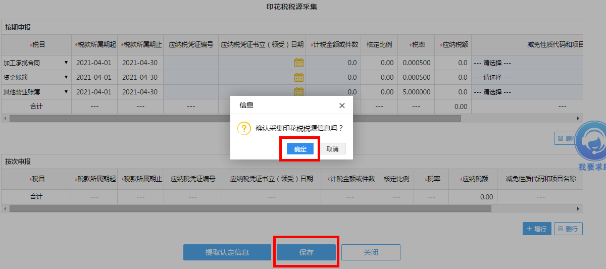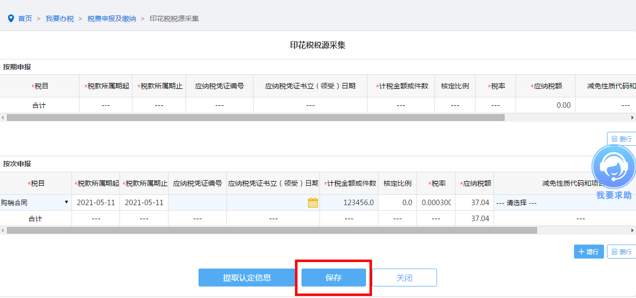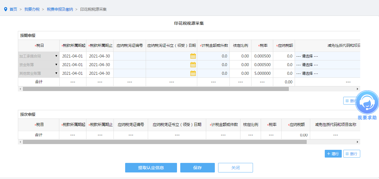 如您未进行印花税税源信息采集,您可根据具体情况填写按期申报或按次申报明细表,点击保存按钮确定完成印花税税源信息采集。