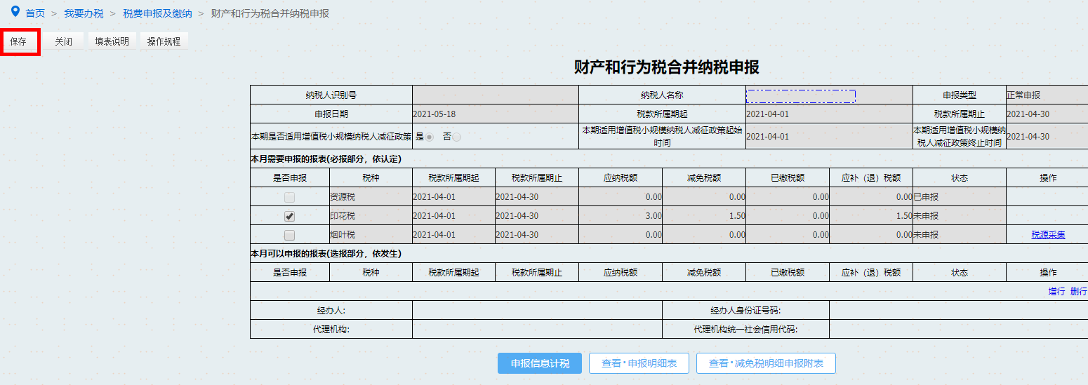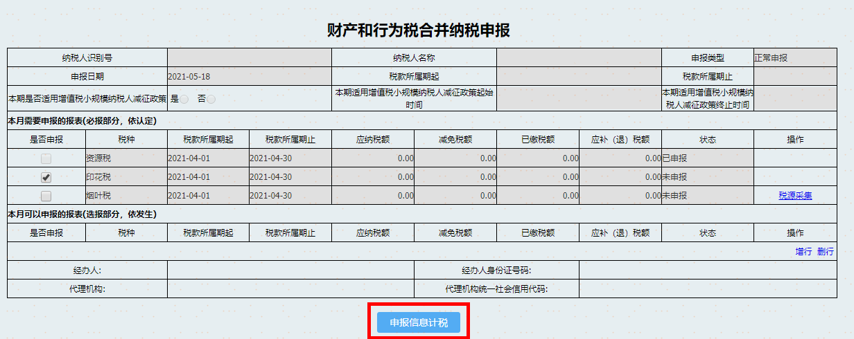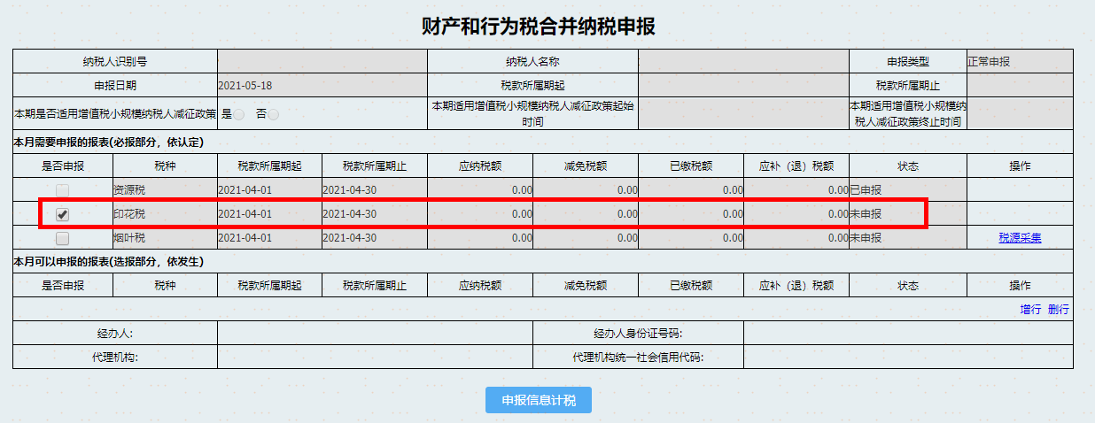 纳税人进入申报缴纳界面,点击财产和行为税合并纳税申报进行申报。选择需要申报的税种(以印花税为例),点击【申报信息计税】按钮带出申报信息。