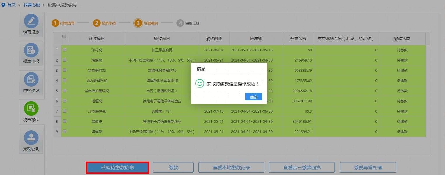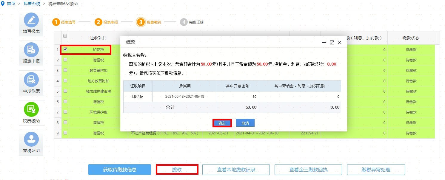 点击【获取待缴款信息】按钮自行选择缴款方式后点击确定,获取缴款信息,选择印花税点击【缴款】按钮确定缴款。