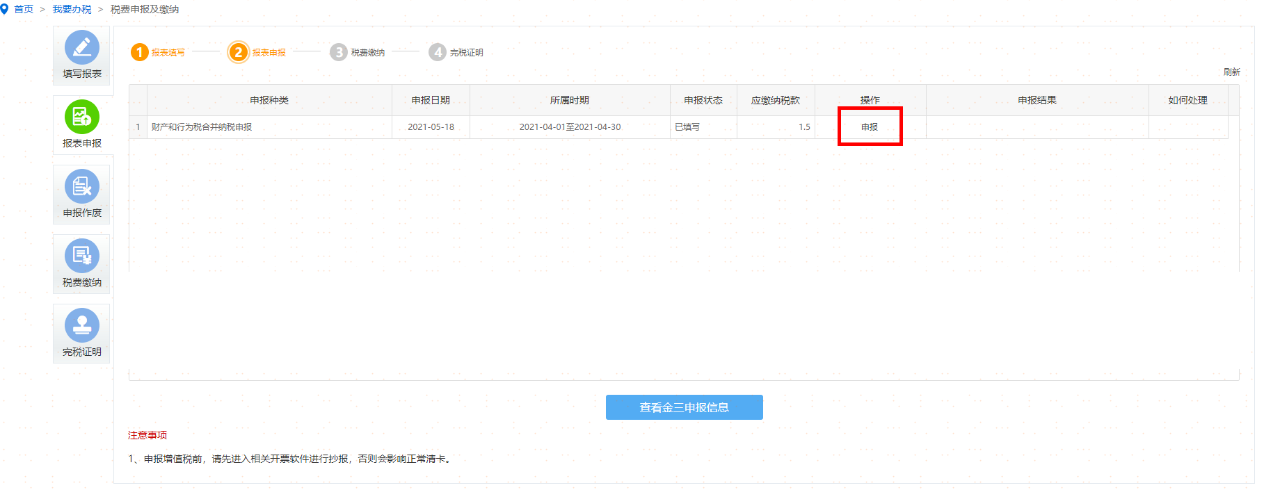 保存完成后可点击申报按钮进行申报,点击【查看详情】按钮可查询申报结果。