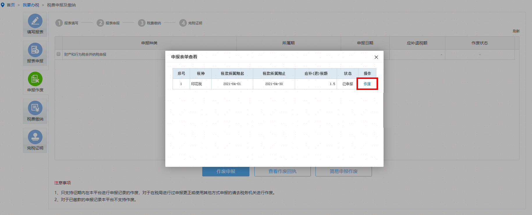 选择需要作废的申报表,点击【作废】按钮完成作废。