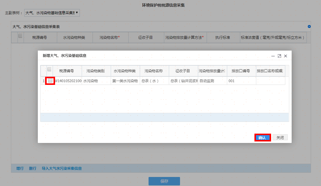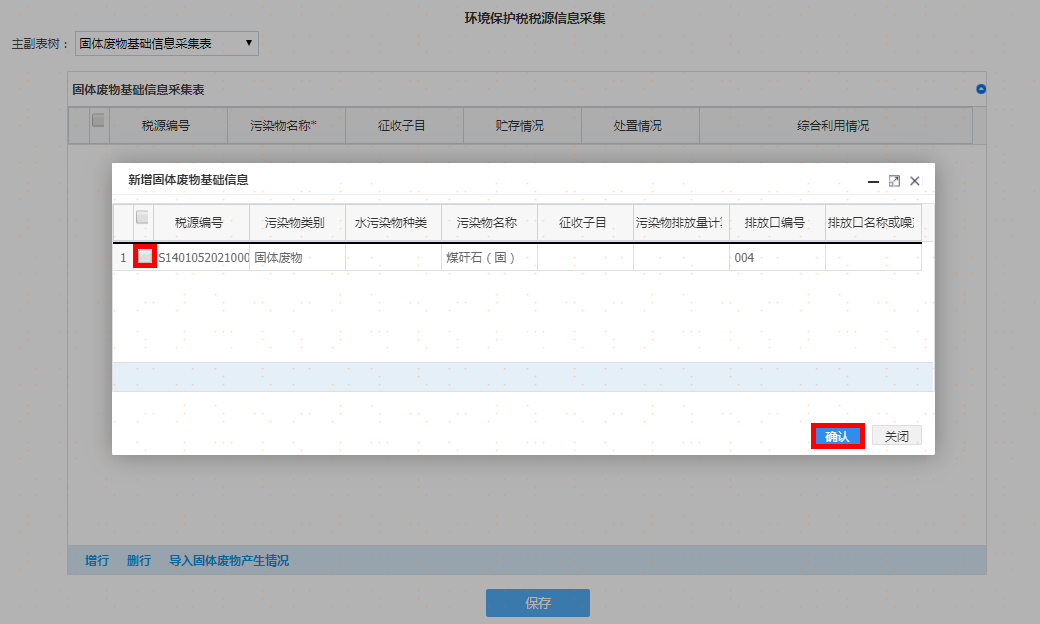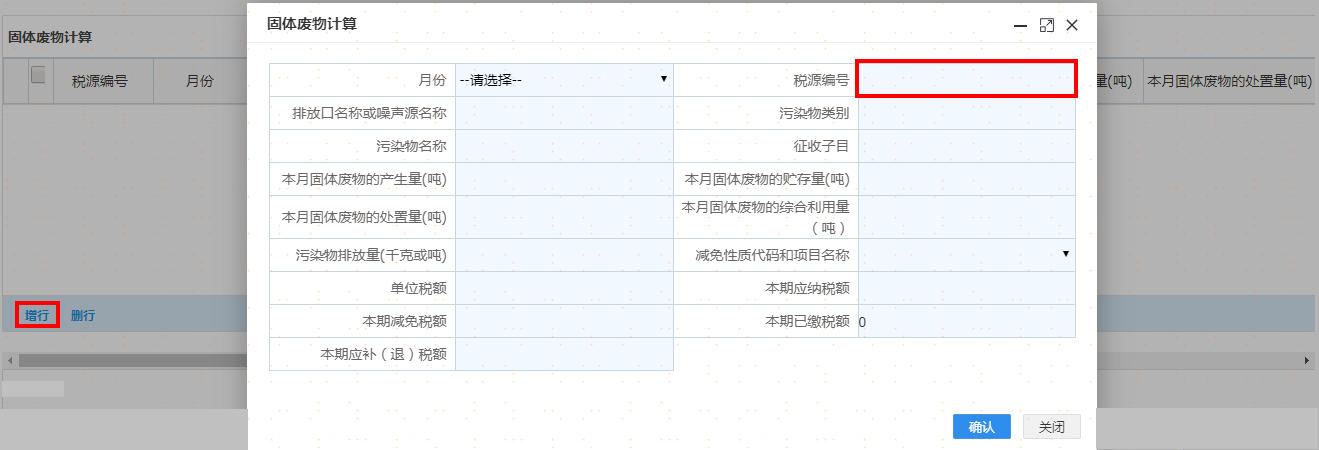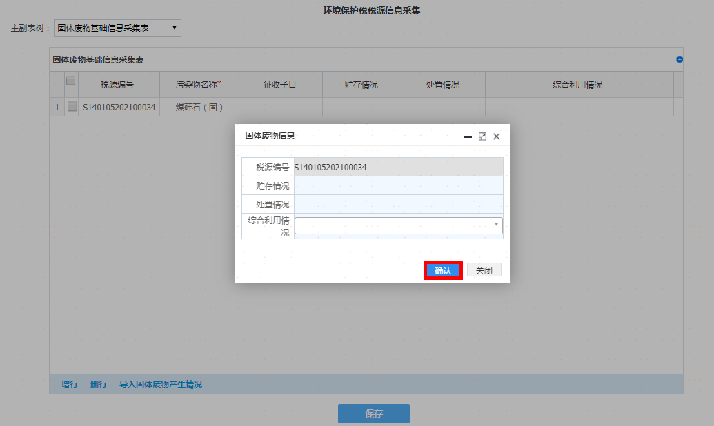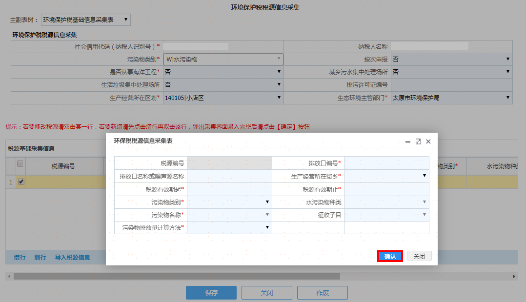 选择污染类别及其他信息后点击增行再双击该行,弹出采集界面录入完毕后请点击【确认】按钮,重复操作,可添加多项税源信息。如图: