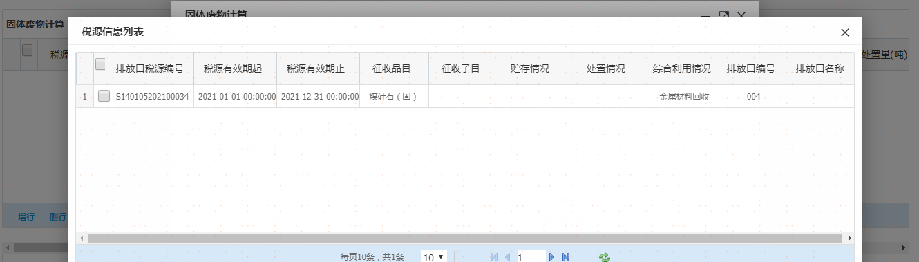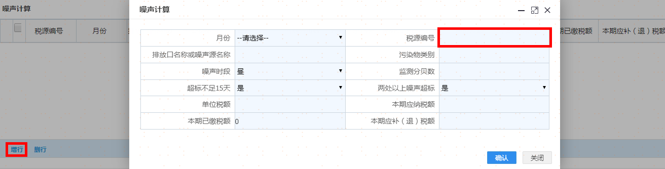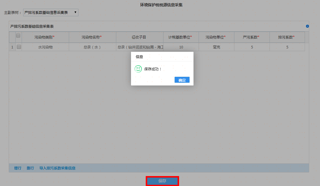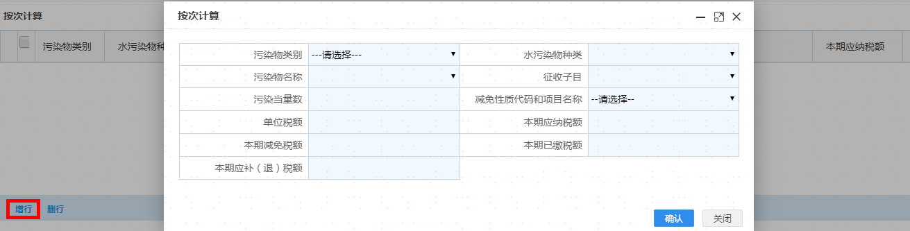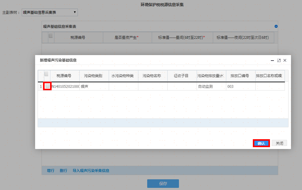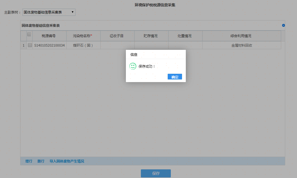 选择污染类别及其他信息后点击增行再双击该行,弹出采集界面录入完毕后请点击【确认】按钮,重复操作,可添加多项税源信息。如图: