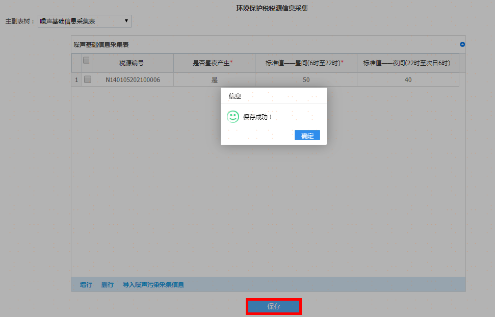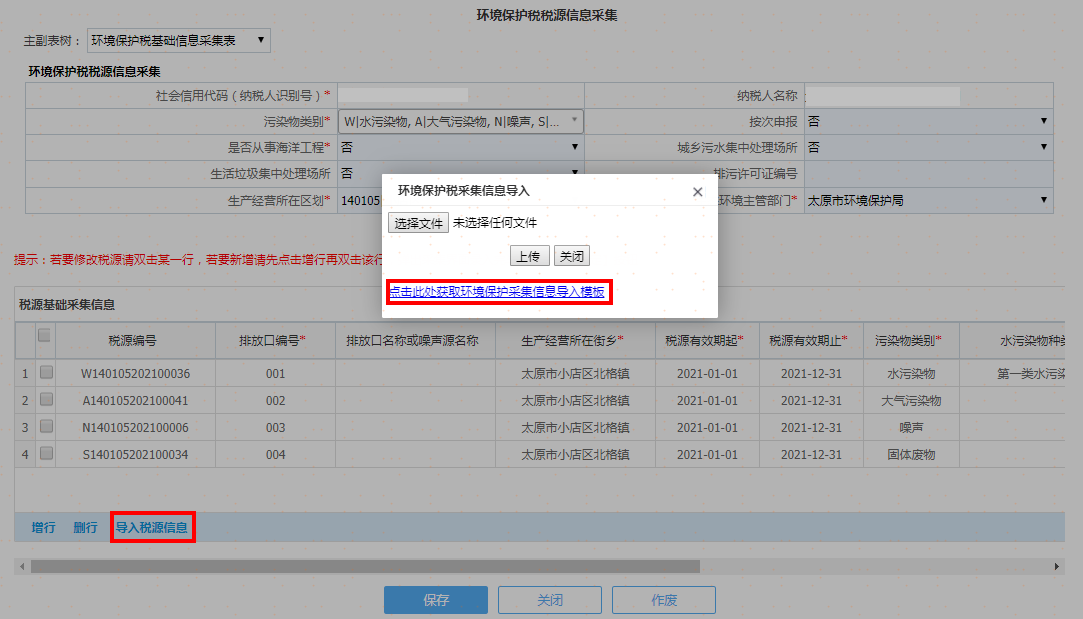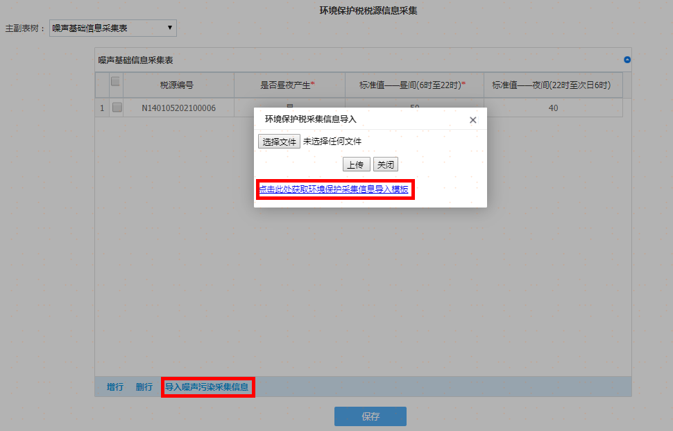 如果税源信息较多时可以通过“导入噪声污染采集信息”获取导入模板进行导入操作,如图: