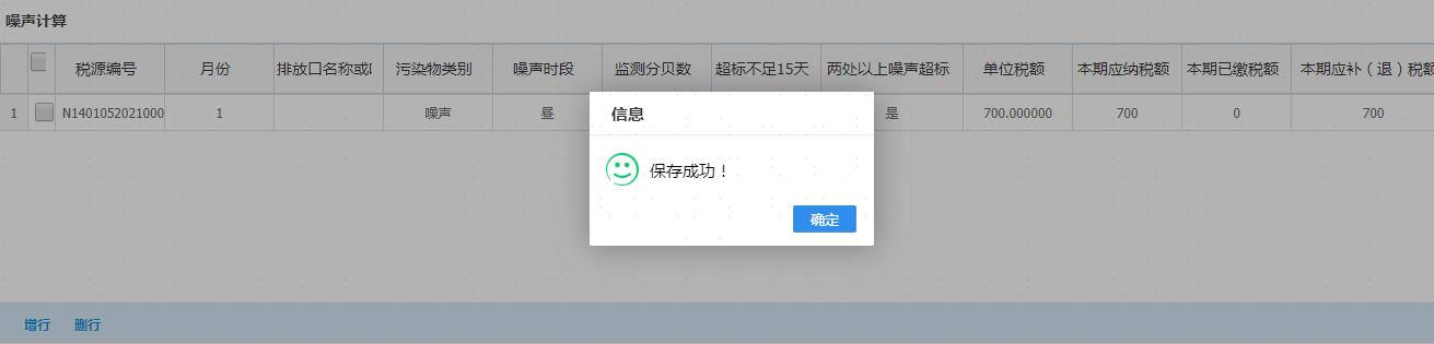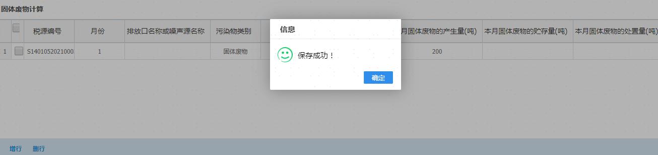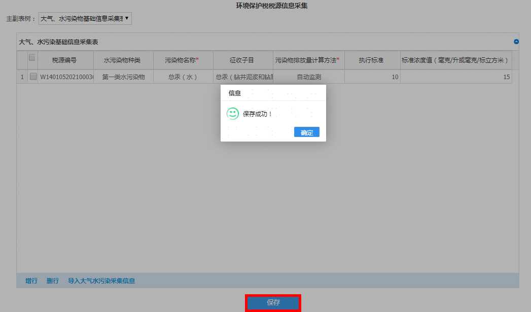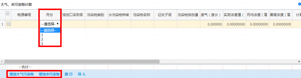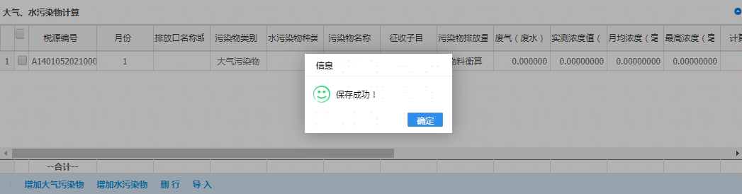 点击“增加大气污染物”或者“增加水污染物”,增行后先选择月份,再双击该行弹出税源明细信息进行选择,录入完成后点击“保存”按钮,如图: