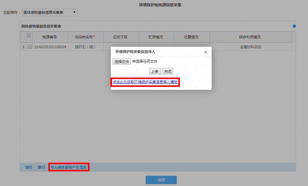 如果税源信息较多时可以通过“导入固体废物产生情况”获取导入模板进行导入操作,如图: