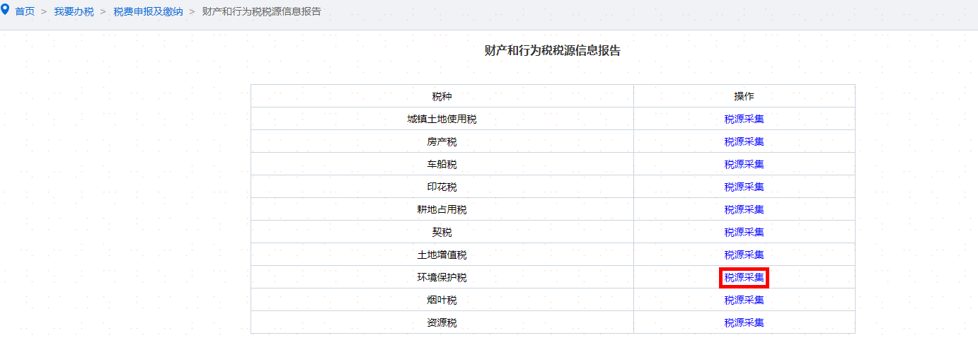 纳税人进入申报缴纳界面,点击财产和行为税税源明细报告进行税源信息采集,选择环境保护税,点击【税源采集】进行环境保护税税源信息采集。