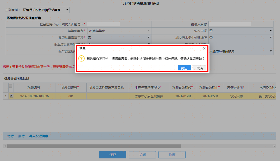 删除:选中税源信息后进行删除操作。
