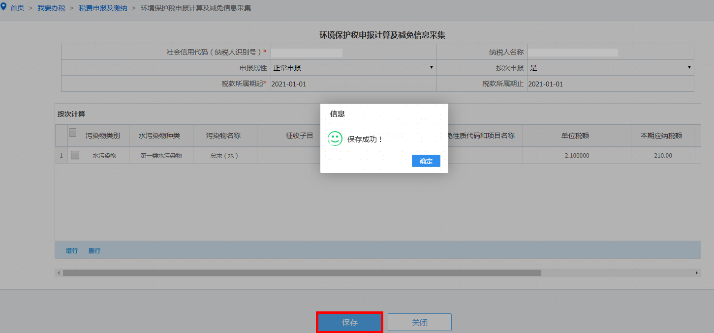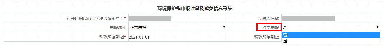 采集完环境保护税税源信息主附表后,根据主表按次申报栏位“是、否”,进行申报计算及减免信息采集。
