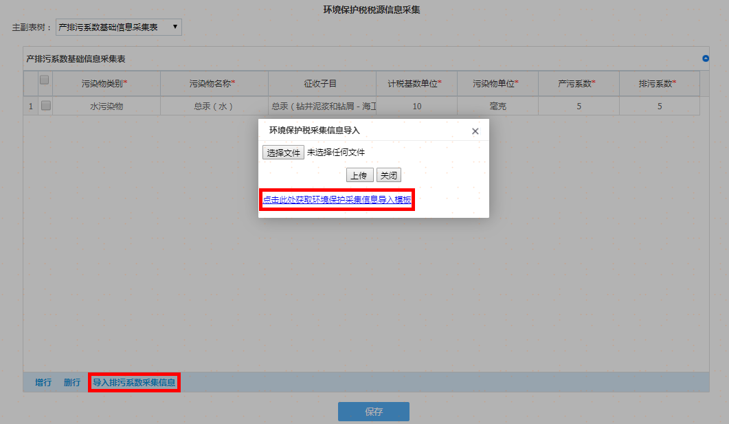 如果税源信息较多时可以通过“导入排污系数采集信息”获取导入模板进行导入操作,如图: