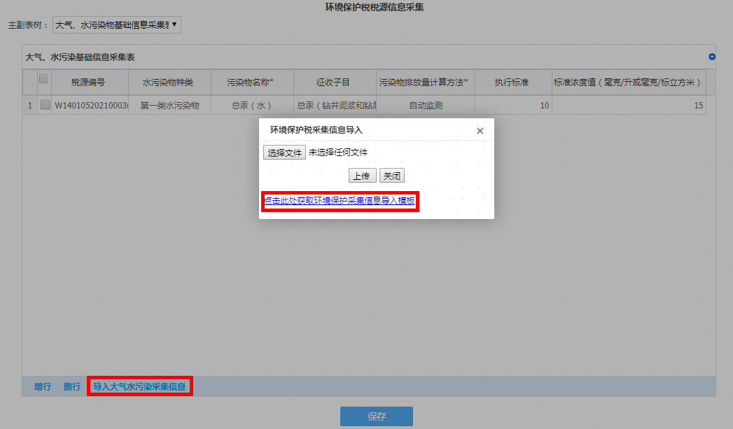 如果税源信息较多时可以通过“导入大气水污染采集信息”获取导入模板进行导入操作,如图: