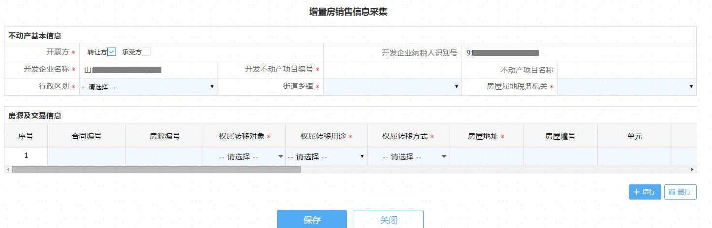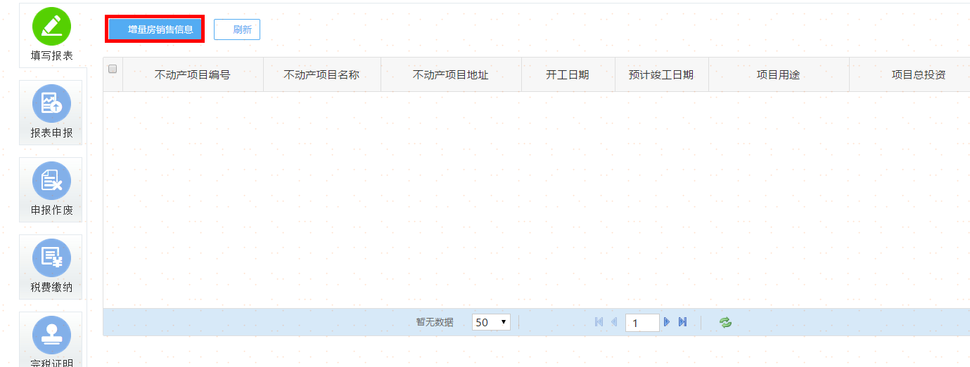 纳税人点击增量房房源信息报告及变更进入,点击“增加”按钮,手工录入进行保存。如图