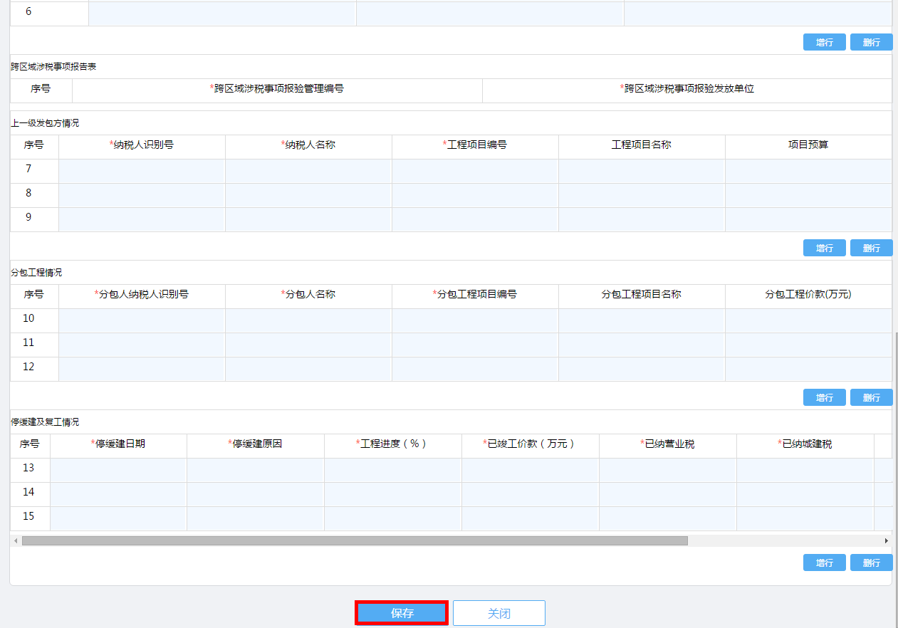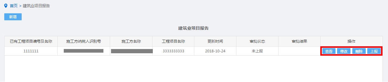 纳税人点击建筑业项目报告进入,点击“新增”按钮,手工录入进行保存。如图