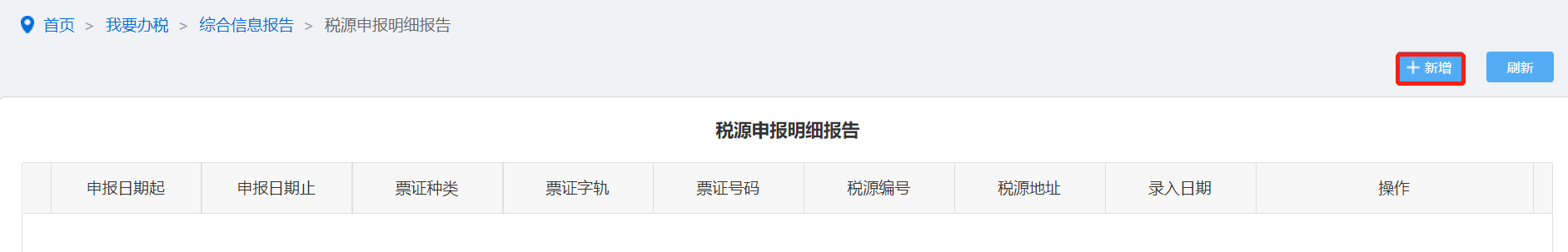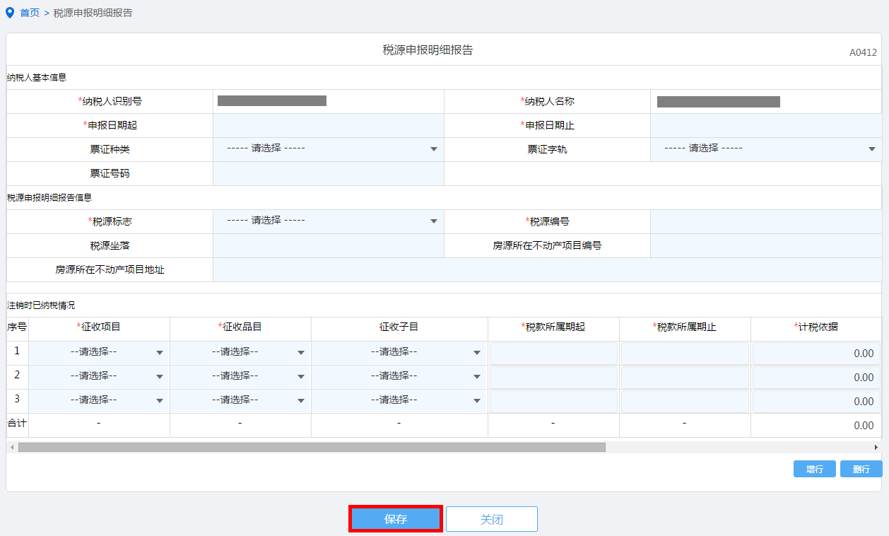 纳税人点击税源申报明细报告进入,点击“新增”按钮,手工录入进行保存。如图