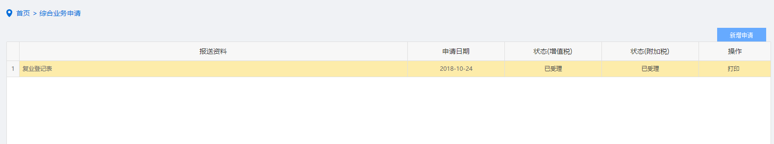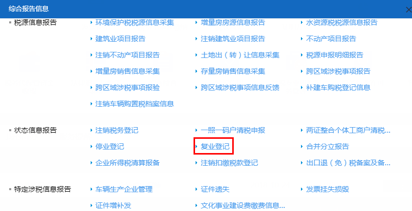 首页→〖综合信息报告〗→〖状态信息报告〗→〖复业登记〗