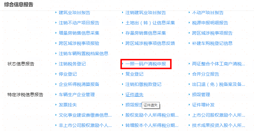 首页→〖综合信息报告〗→〖状态信息报告〗→〖一照一码户清税申报〗