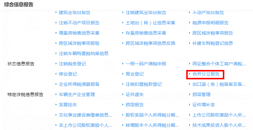 首页→〖综合信息报告〗→〖状态信息报告〗→〖合并分立报告〗→填写