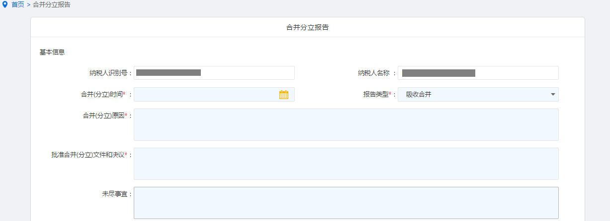 进入操作页面,填写《合并分立报告表》。填写完成后保存提交。