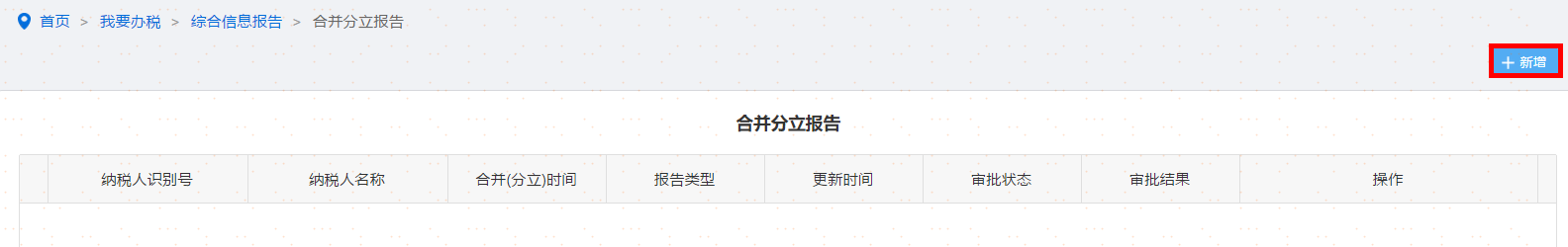 点击“合并分立报告”功能模块,点击新增按钮进入,如图