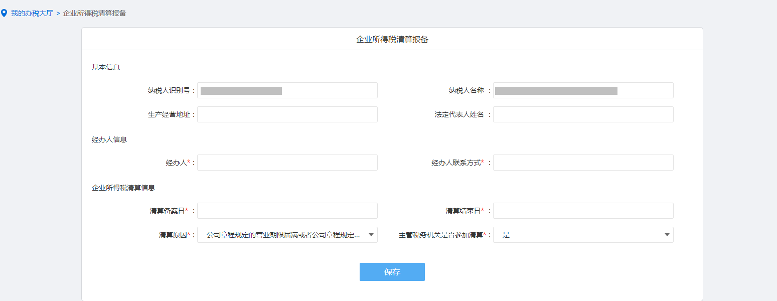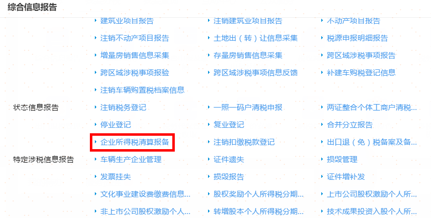 首页→〖综合信息报告〗→〖状态信息报告〗→〖企业所得税清算报备〗→填写
