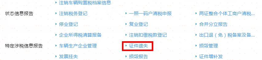 首页→〖综合信息报告〗→〖特定涉税信息报告〗→〖证件遗失〗→填写